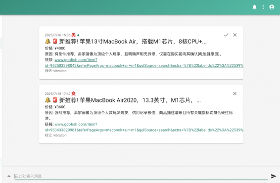 即时通知: 支持通过 ntfy.sh、企业微信机器人和 Bark,将符合AI推荐的商品立即推送到你的手机或桌面。