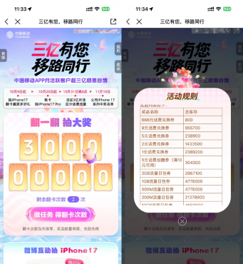 移动APP搜索“三亿有您”->简单流量得次数翻牌,抽1~666亓话费兑换券或加赠券、2GB流量券等奖励