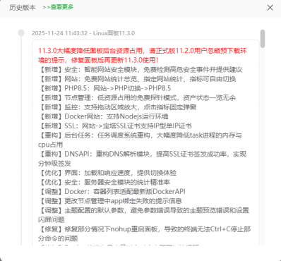 11.3.0大幅度降低面板后台资源占用,请正式版11.2.0用户忽略预下载环境的提示,修复面板后再更新11.3.0使用!