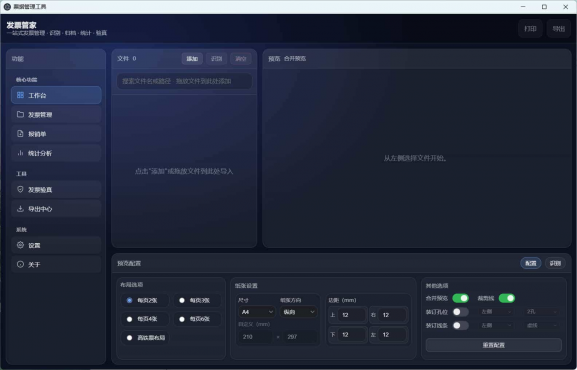 当前开放功能:票据文件导入(支持PDF、图片、OFD格式),多文件合并为PDF文件