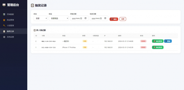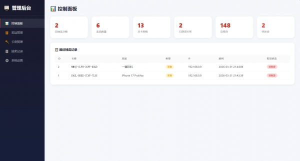 进入后台 → 卡密管理 → 批量生成卡密- 可选择绑定特定奖品(该卡密必中指定奖品)